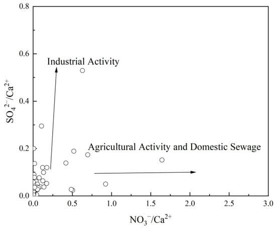 When studying the impact of human activities on groundwater, the ratios of SO42−/Ca2+ and NO3−/Ca2+ are commonly used to identify the primary influencing factors. If SO42−/Ca2+ < NO3−/Ca2+, the groundwater is considered to be significantly influenced by agricultural activities and domestic wastewater. Conversely, if SO42−/Ca2+ > NO3−/Ca2+, industrial and mining activities are the dominant influences [29]. As shown in Figure 9, the average concentrations of SO42− and NO3− in the groundwater of the study area are only 2.26 mg/L and 2.86 mg/L, respectively, indicating that the groundwater in the bedrock mountainous area is largely unaffected by human activities. Only a few sampling points show minor influences from agricultural activities and domestic wastewater.