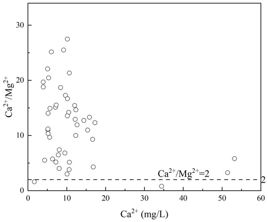 Ca2+ and Mg2+ in groundwater primarily originate from the weathering and dissolution of evaporite minerals. A Ca2+/Mg2+ ratio between 1 and 2 suggests that Mg2+ and Ca2+ are mainly derived from the weathering of carbonate rocks, while a Ca2+/Mg2+ ratio greater than 2 indicates that the dissolution of evaporite minerals (e.g., gypsum) and silicate minerals plays a dominant role [30]. As shown in Figure 10, only two sampling points fall within the 1–2 range, while the remaining 43 points have Ca2+/Mg2+ ratios greater than 2, with an average value of 9.89. This demonstrates that the groundwater in the study area is primarily influenced by the weathering and dissolution of silicate rocks and gypsum. However, the average SO42− concentration is only 2.26 mg/L, suggesting that the dissolution of gypsum is limited, and the dominant source of ions is the dissolution of silicate minerals.