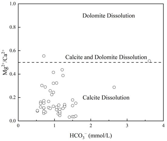 The ratio of Mg2+/Ca2+ in relation to HCO3− is commonly used to assess the contribution of dolomite or calcite to the material sources in groundwater within carbonate rock weathering zones. In the study area, the average Mg2+/Ca2+ ratio in groundwater is 0.16 (Figure 11), with most values clustered around 0.16. Only two sampling points exceed 0.5, indicating that the weathering and dissolution of calcite dominate in the study area. These two points, however, reflect the combined influence of calcite and dolomite weathering and dissolution. This further supports the conclusion that calcite dissolution is the primary process controlling groundwater chemistry in the region, with limited contributions from dolomite.