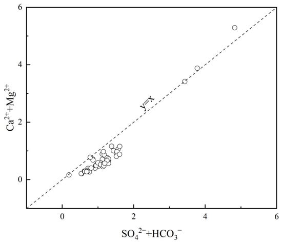 As shown in Figure 12, only two points have (Mg2+ + Ca2+) > (HCO3− + SO42−). Field investigations revealed that these two points are located in strata of Carboniferous dolomitic limestone, which are distinctly controlled by carbonate rocks. The remaining points are all below the 1:1 line, indicating that additional cations such as K+ and Na+ are required to balance the anions to achieve equilibrium. These cations, K+ and Na+, primarily originate from the weathering and dissolution of silicate rocks, suggesting that the dissolution of silicate rocks is widespread and dominant in the study area. Only two points have (Mg2+ + Ca2+) < (HCO3− + SO42−). Field surveys indicated that these two points are exposed in strata of Carboniferous dolomitic limestone, which are significantly influenced by carbonate rocks. The other points are all on the 1:1 line. In conjunction with Figure 8, this suggests that additional anions, such as silicate ions, are needed to balance the charges. The SiO32− mainly comes from the weathering and dissolution of minerals like quartz, feldspar, and mica, indicating that the dissolution of silicate rocks is common and plays a significant dominant role in the study area.