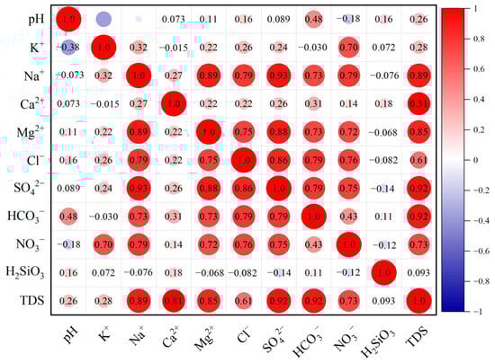 As shown in Figure 13, the statistical analysis software SPSS was used to calculate the Pearson correlation coefficients for Cl−, SO42−, HCO3−, NO3−, K+, Na+, Ca2+, Mg2+, NO3−, TDS, and H2SiO3 in the groundwater of the study area.