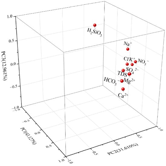 The third principal component (PC3) accounts for 12.961% of the total variance, with high positive loadings (>0.75) observed for H2SiO3 and Na+. These loadings are attributed to the hydrolysis of sodium-rich silicate minerals (e.g., albite), which release H2SiO3 and Na+ into groundwater through weathering processes. This mechanism not only governs the hydrochemical evolution of the aquifer but also serves as a primary factor in the formation of metasilicic mineral water, characterized by elevated H2SiO3 concentrations (>30 mg/L) and Na+-enriched compositions.
