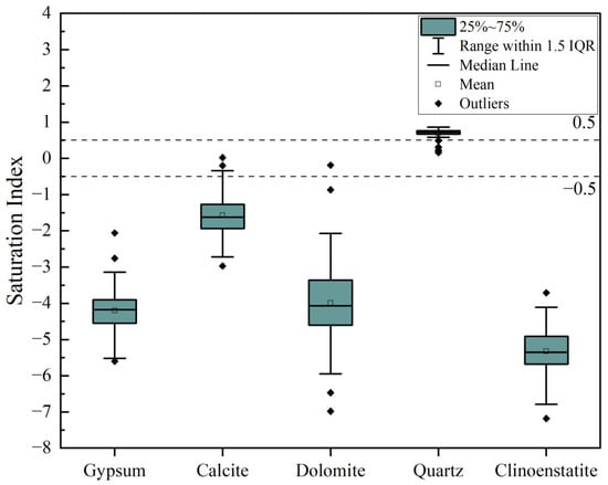 The dissolution dynamics of minerals during water–rock interactions are critical for deciphering geochemical cycling and solute acquisition mechanisms in aquifer systems. To assess these processes, we employed PHREEQC to simulate saturation indices (SI) of key minerals (gypsum, calcite, dolomite, quartz, and clinopyroxene/clinostatite) across groundwater samples from the study area. As illustrated in Figure 15, the boxplot statistically synthesizes SI distributions derived from hydrogeochemical datasets, with the interquartile range (IQR: 25th–75th percentiles) delineating the central 50% of mineral saturation states. The median line represents equilibrium tendencies, while whiskers (1.5 × IQR) define natural variability thresholds; outliers beyond this range signify extreme SI anomalies attributable to localized geochemical perturbations (e.g., evaporite dissolution hotspots or kinetic inhibition zones). This visualization quantifies both equilibrium constraints (e.g., near-saturation medians for gypsum, SI ≈ 0) and disequilibrium drivers (e.g., quartz supersaturation across all samples), providing a robust framework to differentiate lithologically controlled weathering patterns from anthropogenically altered solute regimes.