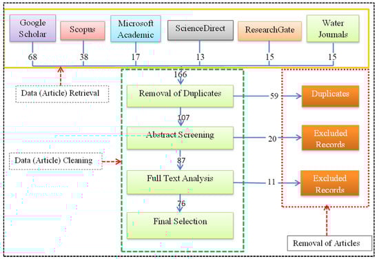 - Initial Identification: A systematic search was conducted utilizing a combination of keywords, citations, and related articles to compile a diverse range of relevant publications. The keywords employed in the search include “groundwater”, “water scarcity”, “arid”, “semi-arid”, “water harvesting”, “effective water harvesting”, “water harvesting system”, “water harvesting techniques”, “rainwater harvesting”, “flood water harvesting”, “groundwater harvesting”, “qanat system”, “underground dams”, “groundwater recharge”, “sources of water”, “natural recharge”, “artificial recharge”, “surface spreading”, “injection well”, “induced infiltration”, “recharge estimation”, “infiltration”, and “runoff curve number”.A total of 166 articles were gathered from various databases in August 2024: 68 articles from Google Scholar, 38 articles from Scopus, 17 articles from Microsoft Academic, 13 articles from ScienceDirect, 15 articles from ResearchGate, and 15 articles from other water-related journal websites. After the collection, duplicate entries were automatically removed, resulting in 107 unique articles.