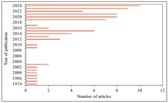 - Final Selection: After conducting a thorough analysis of the full texts, a final selection of 76 publications was made. Of these, 72 articles were published between 2000 and 2024, while the remaining four articles date back to 1974, 1988, 1996, and 1997. The selected articles were reviewed in detail, and the information collected was systematically organized.