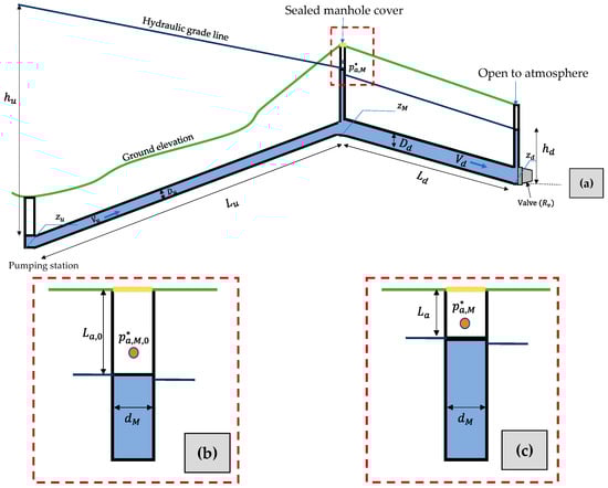 The current hydraulic analysis does not consider the scenario for analysing the hydraulic grade line explored in this research (sealed manhole cover), where the air pocket pressure in the sealed manhole () changes over time due to the compression of the air phase. The subscript 0 refers to an initial condition. In this condition, the air pocket size and the air pocket pressure are identified as and , respectively, as shown in Figure 1b,c. Figure 1c shows the values of the air pocket size and pressure for an intermediate condition.