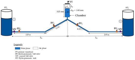 To generate a pressurised system, all regulating valves are opened with a constant flow of 2.07 L/s. The system starts in a steady-state condition. The chamber has an internal diameter () of 140 mm and a height of 325 mm. The chamber (manhole) begins with an initial air pocket size of 75 mm. Finally, two hydro-pneumatic tanks are placed to guarantee that the water installation is under pressure. The pressure levels of the upstream and downstream hydro-pneumatic tanks are 2 bars and 1 bar, respectively. At the beginning, the air pocket in the chamber is in an atmospheric condition. A pressure transducer S-10 WIKA was installed at the chamber’s top to record absolute air pocket pulses.