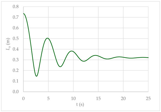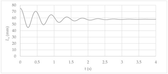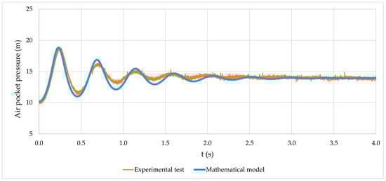 Air pocket size oscillations in the chamber were analysed by employing the proposed model, as shown in Figure 4. The air pocket size started with an initial value of 75 mm. After that, some fluctuations occurred since the chamber was filled with water during the transient event. The filling of the chamber caused compression of the air pocket, and then its value decreased at the end of the transient event (at 4 s) to 57.6 mm. The minimum value of the air pocket size, 44.3 mm, coincides with the peak of the chamber’s absolute pressure (at 0.23 s).