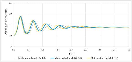 The proposed model’s only parameter is the polytropic coefficient. For this reason, a sensitivity analysis was conducted to observe its behaviour, as shown in Figure 5. An entire range was considered from 1.0 (isothermal evolution) to 1.4 (adiabatic evolution). The maximum air pocket pressure peak considering an isothermal evolution was found to have a value of 19.24 m (at 0.24 s), while with an adiabatic evolution, the maximum attained value was 18.99 (at 0.22 s). In all cases, the air pocket pressure reached 13.98 m.