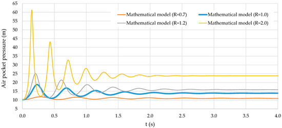 The value of R varied from 0.7 to 2.0, as illustrated in Figure 6. A higher R-value corresponds to a more significant air pocket pressure head peak. For example, when employing a relationship of 0.7, a pressure peak of 11.89 m is observed, whereas using a value of 2.0 results in a maximum pressure peak of 61.30 m. As expected, after the hydraulic events, the pressure reaches 11.00 m and 23.83 m using R-values of 0.7 and 2.0, respectively.