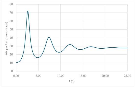 The proposed model was employed to compute the air pocket pressure head in the case study, as shown in Figure 7. Although the initial air pocket pressure started at 10.33 m, it could increase to a maximum value of 72.01 m (at 2.63 s) due to the compression of the air phase. Subsequently, oscillations occurred, with a few peaks, until the system reached a steady-state condition.