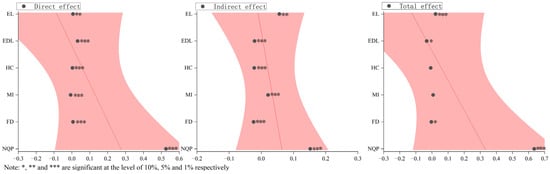 For population growth (POP), although its influence coefficient is positive, it does not pass the significance test, indicating that the increase in the natural population growth rate has limited direct impact on MEHQ. The influence coefficient of transportation infrastructure (TI) is significantly negative, and the value is small, indicating that the current construction and development of transportation infrastructure has no obvious promoting effect on MEHQ and may even have a certain restricting effect. This may be due to the fact that the layout, planning, and operational efficiency of transportation infrastructure cannot fully adapt to the needs of MEHQ, resulting in its supporting role in MEHQ not having been fully played. The influence coefficient of government financial expenditure (GOV) is also significantly positive, indicating that government financial support is an important force to promote MEHQ. The influence coefficient of the number of industrial enterprises above a designated size (ENT) is negative and has passed the significance test, which indicates that the excessive number or unreasonable structure of industrial enterprises above a designated size may have a certain negative impact on MEHQ. This may be due to the excess capacity of some industrial enterprises, lack of innovation capacity, environmental standards, and other problems, resulting in its role in promoting MEHQ not being obvious, and it may even become a restricting factor. Although the influence coefficient of cultural industry strength (CUL) is positive, the significance level is relatively low, reflecting that the current contribution of the cultural industry to MEHQ needs to be further improved.