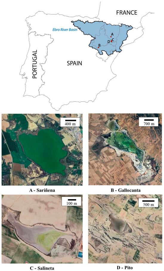 Hueso-Kortekaas, K.; Delgado-Mellado, N.; Calzada-Funes, J.; Sanchez-Mata, C.; Castañeda, C.; Cledera-Castro, M.d.M. Microplastics in Inland Saline Lakes of the Central Ebro Basin, NE Spain. Water 2025, 17, 989. https://doi.org/10.3390/w17070989