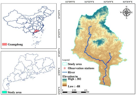 Overview of the study region, including the locations of the observation stations available for monitoring within the Chebei Watershed catchment area.