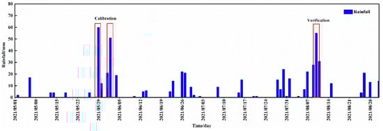 We used the 29 May 2021 and 2 June 2021 rainstorm events to calibrate the developed model and the 10 August 2021 rainstorm event to verify the result (Figure 2). The optimized relative parameter values for each of these calibration exercises are presented in Table 1.