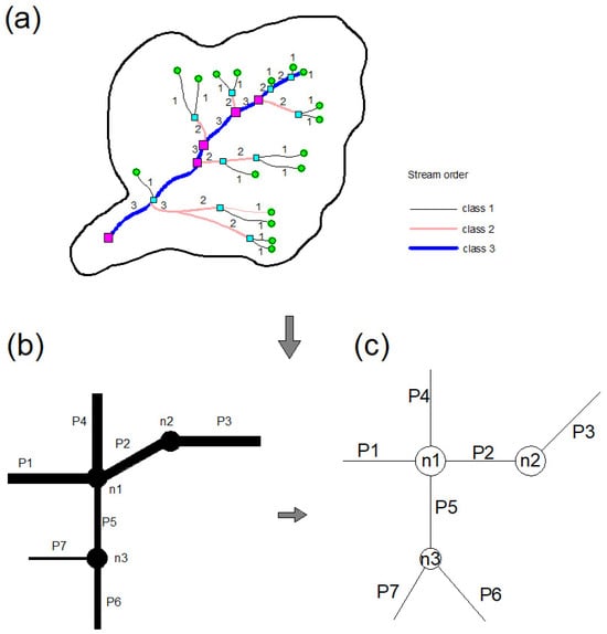 Schematics of the Strahler ordering method applied in this study. (a) Schematic diagram of river network topology; (b) drainage networks in this schematic example; (c) the drainage network structure was simplified according to the Strahler ordering method.