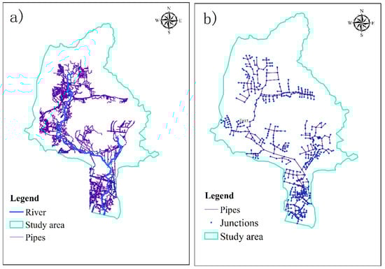 The original underground drainage network in the Chebei Watershed is complex and dense (Figure 4a). If it is directly applied to the flood model, it will seriously complicate and reduce the computational speed of the model. Based on the Strahler ordering method, the original 95,219 pipes and 95,318 nodes were simplified to 604 and 606 (Figure 4b).