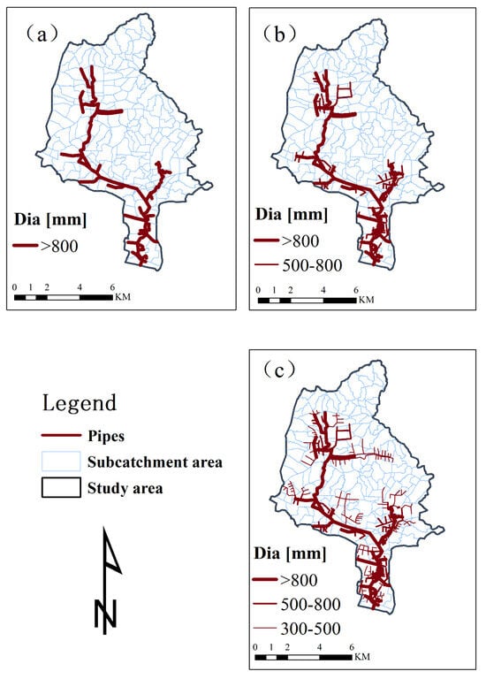 Step 3, the topological relationship of drainage networks should be analyzed according to the Strahler ordering numbers. The stream possessing the highest Strahler number within the network is the largest. Within the study area, networks of varying hierarchies were analyzed for diverse pipe diameters, commencing with the largest diameter and progressively adjusting the diameter threshold to “expand” the network from its skeletal framework to its entirety (Figure 3b,c).