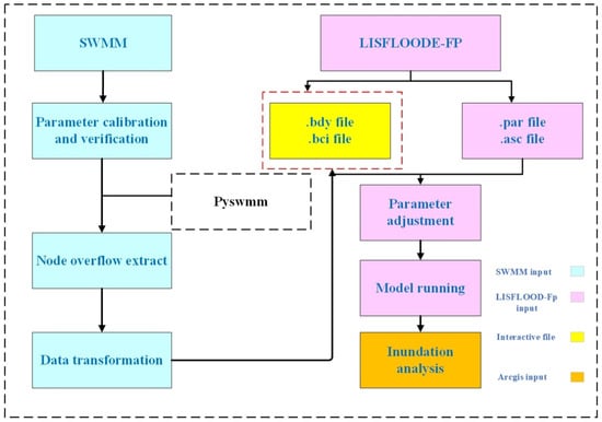 At every network node, it offers insights into the changes in water levels and flow discharges over both space and time across the network. In Equations (2) and (3), H is the nodal piezometric head (sum of geodetic elevation and water level), is the net inflow to the node (inflow–outflow). is defined as the ‘node assembly’ surface area and is calculated based on the horizontal surface area of both the node (when available) and half the length of each conduit linked to the node itself [21,22]. The SWMM model is designed to simulate the hydrodynamics of one-dimensional rainwater drainage systems. Being an open-source management model, it allows for secondary development. This capability was utilized to integrate the SWMM with the LISFLOOD-FP model.