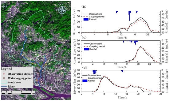 Location of the actual waterlogging points (a), rainfall hydrographs, observed and simulated hydrographs for (b,c) calibration and (d) verification events in the Chebei Watershed.