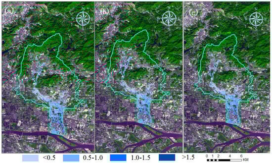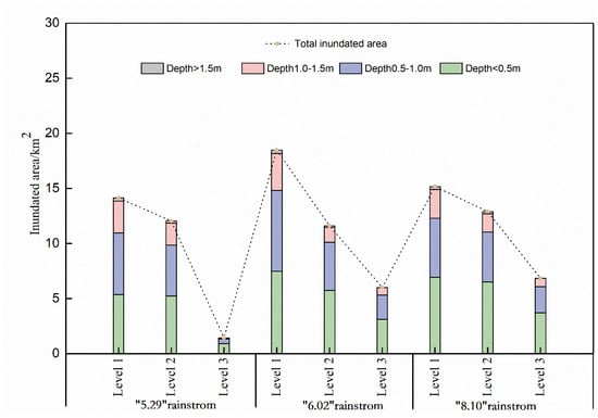 The greater the number of pipes selected, the closer to the actual state. More pipes mean assigning more hierarchies for networks and higher drainage density. The total inundated area decreased with the increase of drainage network density (Figure 12). Especially for waterlogging points with a depth above 1.5 m that have the greatest impact on road traffic and pedestrians, these decrease to shallower depths when the drainage network hierarchy reaches Level 3. Taking “5.29” rainstorm events as an example, the total inundation area was decreased from 14.14 ha to 1.43 ha, when the level of drainage network hierarchy was increased from Level 1 to 3. Also, all of the waterlogging points where the depth ranged from 0.5 m to 1.5 m were reduced.