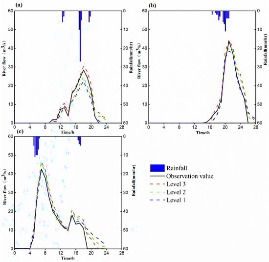 All of the flow processes were consistent in the three typical rainstorms (Figure 9). As for the 29 May 2021 rainstorm event (Figure 9a), with the continuous simplifying of the drainage networks, the flow hydrograph tended to decrease due to the rapid and directional drainage function of the drainage networks gradually becoming weakened. The processes of the beginning and regression of the flow under a drainage network hierarchy of Level 3 were basically consistent with the observations from the 29 May 2021, and 2 June 2021 rainstorm events.