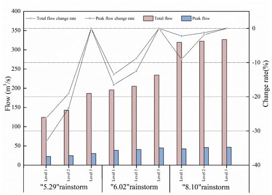 According to the relative changes in the rates of total flow and peak flow, a drainage network hierarchy of Level 3 was used as the basis to quantitatively evaluate the impact of the drainage network structure’s impact on the hydrologic response. With continuous simplification, the density of drainage networks will become lower. Meanwhile, the ability for rapid drainage will be weakened. The total flow and peak flow for the 29 May 2021 rainstorm event under drainage network hierarchies of Level 1 and Level 2 were 124.41 m3/s, 22.45 m3/s and 142.84 m3/s, 24.66 m3/s, respectively. The corresponding relative change rates of total flow and peak flow were −33.18% and −23.29% (Figure 10).