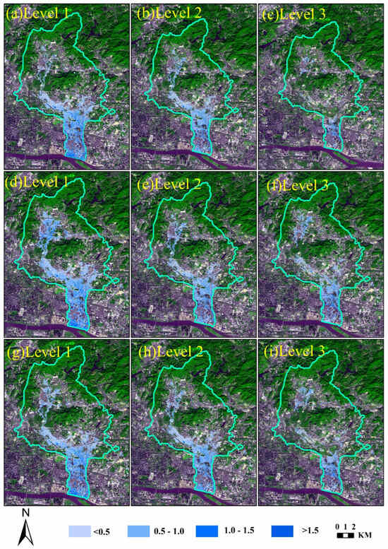 Depth and inundated area at different complexity structures in the 29 May 2021 (a–c), 2 June 2021 (d–f), and 10 August 2021 (g–i) rainstorm events.