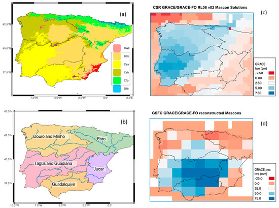 Study region (Iberian Peninsula) and GRACE data comparison. (a) Köppen climate zones (major classes are Cfb: temperate without dry season, warm summer; Csb: temperate, dry summer, warm summer; Csa: temperate, dry summer, hot summer; BSk: arid, steppe, cold; Dfb: cold, no dry season, warm summer; and BWk: arid, desert, cold) according to [60,61]. Black lines indicate borders of river basins. (b) River basins from the Global Runoff Data Center [62]. (c) Snapshot of GRACE-CSR Mascon solution (from [63]). (d) Snapshot of the GRACE reconstructed product (from [47]) used in this study.