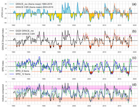 Time series of GRACE and hydrological extreme indices averaged over the entire Iberian Peninsula. (a) Total water storage anomaly (ΔTWS) from the reconstructed GRACE-REC product (1980–2019) used in this study and GRACE CRS Mascon solution (2003–2019) superimposed for comparison. (b) GRACE drought index (GGDI) computed from (a), with purple and orange lines marking the −1.28 and + 1.28 thresholds for severe wet and dry events, respectively. (c) SPEI-6 and SPEI-12 indices averaged over Iberia. Large-scale severe droughts, marked in orange, occur when the indices fall below the −1.28 threshold. (d) Superposition of time series in (b,c). Events classified as moderate to extreme lie within the threshold tolerance indicated by light-shaded purple and orange bands.