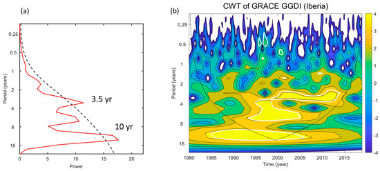 The statistical properties of total water storage anomalies are more clearly interpreted using the CWT analysis, which allows analysis of both time and frequency information simultaneously (Figure 5). The CWT spectrum (Figure 5b) shows the temporal distribution of the power (variance) of the GGDI time series in Iberia as a function of period (scale) over the 30 years of analysis in a color scale that goes from blue (minimum) to yellow (maximum). The power (variance) of the continuous wavelet transform of GGDI is dimensionless because GGDI is a normalized index. The picture displays the evolution in time of the dominant modes of variability and the occurrence of large anomalies in total water storage corresponding to the most intense blue and yellow patches. The three main modes of variability with enough persistence and amplitude to be statistically significant (within white contours) have power concentrations with periods in the 10- to 13-year band (between 1983 and 2007), at 6.5 years (between 1993 and 2006), and at 3.5 years (between 2000 and 2015). At smaller scales with less energy, one can observe several scattered peaks at periods of less than 1 year, as, for instance, in 2001, which was an anomalously wet year. The global spectrum is obtained by integrating the CWT spectrum over the period of study (1980–2019), allowing us to easily identify the frequencies that contribute most significantly to the overall signal. When averaged over time, only two variability modes remain statistically significant at the 5% level, peaking at 3.5 and 10 years (Figure 5a).