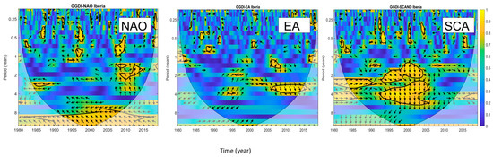 Figure 6 shows the wavelet coherence between the NAO, EA, and SCAND climate indices and the GGDI. Each climate index exhibits consistent phase relationships at characteristic periods, although sometimes restricted to specific time windows: NAO at long-term periods of 10–13 years, EA at a 3.5-year periodicity, particularly after 2005, and SCAND at periods of 2–6 years, mainly before 2005. Among these, NAO and SCAND exert the most widespread influence over Iberia, showing statistically significant coherence patches at multiple multiannual periodicities. Regarding the phase angle, there is a dominant horizontal anti-phase (180°) relationship between NAO and GDDI, which aligns with expectations. It is well known that during NAO-negative phases low-pressure systems in the North Atlantic are shifted southwards, leading to increased precipitation and increased river discharges in Iberia [50]. Thus, the out-of-phase relationship is in agreement with the fact that precipitation, aquifer recharge, and hence total water storage on land are negatively correlated with NAO. In contrast, EA and SCAND show arrow patterns that are mostly diagonal or pointing downward, indicating that changes in these indices either precede or follow shifts in the TWS time series.