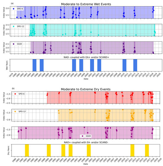 (a) Timeline of SPEI-6, SPEI-12, and GGDI events exceeding the threshold criteria (+1.28 and −1.28) compared to the timings of coupled NAO, EA, and SCAND phases. Wet events and combinations of NAO− and EA+ or SCAND+ phases. (b) Dry events and combinations of NAO+ and EA− or SCAND− phases. In the SPEI-6, SPEI-12, and GGDI plots, the lines mark the occurrence of events and the dots indicate the value of the index.