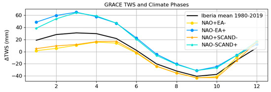 The impact of coupled phases is better illustrated in Figure 8, which displays the GRACE TWS anomalies averaged over years of positive and negative phases. For example, TWS variations for NAO− EA+ correspond to monthly values averaged over years with simultaneous NAO+ and EA− phases. Figure 8 clearly shows that maximum (wet) water storage anomalies occur in years when NAO− coincides with either SCAND+ or EA+ phases (notably, many SCAND+ and EA+ years overlap), while minimum levels (dry) occur during NAO+ and either EA− or SCAND− combinations. The difference in TWS between dry phases (NAO+ EA−/SCAND−) and wet phases (NAO− EA+/SCAND+) is maintained throughout the year, but it is most evident between January and May, since precipitation in Iberia falls essentially during the extended winter season and summer has always negative anomalies.