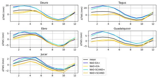 When considering the spatially averaged TWS anomalies within each river basin the results obtained are essentially the same, that is, the anomalies are consistently below the mean (black line) in years of coupled NAO+ EA−/SCAND− and above the average in years of NAO− EA+/SCAND+ combinations (Figure 9). However, the range in the TWS difference between wet and dry years is more notorious in the Douro (10 mm), Tagus (20 mm) and Guadalquivir (5 mm) than in the Ebro (<5 mm), and Júcar (<2 mm) river basins.