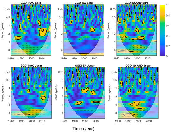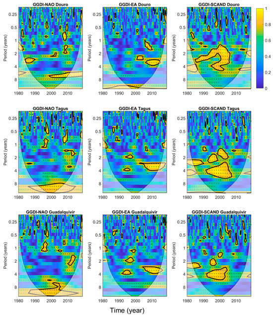 The wavelet coherence definition is similar to a localized correlation coefficient between two continuous wavelet transforms in time–frequency space [69]. This method has been applied to identify time-localized common oscillatory behaviors between the climate indices (NAO, EA, and SCAND) and GGDI at both the whole Iberia and river basin scales, as is shown in wavelet transform coherence (WTC) plots. The wavelet coherence was computed at the 95% confidence level using the algorithm described in Grinsted et al. [70]. The direction of the arrows in the wavelet cross-spectrum represents the relative time lag between synchronized components. When two time series exhibit a positive correlation and are in phase, the arrows point to the right, whereas they point to the left when the correlation is negative, and the series are in antiphase. Areas in time–frequency space with large common power and regular phase relationships are likely to have a cause–effect relationship between the time series.