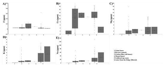 Box plot illustrations of the fluoride (A), calcium (B), magnesium (C), potassium, (D) and sodium (E) concentrations in the analyzed water samples from different WFPSs. The box represents the first quartile (Q1) and the third quartile (Q3), with the median positioned in the center. The interquartile range (IQR) is the span between Q1 and Q3, while the whiskers (vertical lines) indicate the 5th and 95th percentiles.