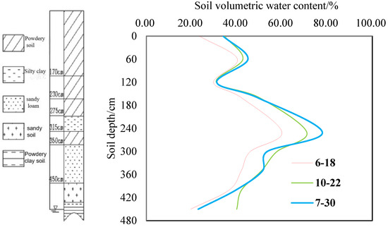 The soil texture of a soil aeration zone affects the function of this zone and the accumulation and migration of nitrate-N. The measured soil moisture content values on certain days in June, July, and October during the experiment were compared with the soil texture (Figure 5). The soil particles were sorted according to the clay content as follows: silty clay > silty loam > sandy loam > sandy soil. During the experiment, the soil moisture content at different depths of the soil profile was continuously monitored. The soil depth of 0–160 cm was an area where the moisture content changed relatively frequently, influenced by atmospheric precipitation, evaporation, and transpiration. The soil moisture content at a soil depth of 160–400 cm was greatly affected by the soil texture, with a higher moisture content at a soil depth of 250–300 cm, where a silty clay layer was distributed. The moisture content decreased at a soil depth of 350–400 cm, where sandy loam and sandy soil layers were distributed. The moisture content in the 450 cm soil layer was also affected by fluctuations in the groundwater level. In the later stages of the experiment, the groundwater level rose from 5.62 m at the beginning of the experiment to 4.68 m. Thus, the moisture content measured at 450 cm on 22 October was much higher than that measured on 18 June.
