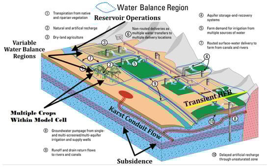 Diagram showing the interdependencies within MF-OWHM of groundwater flow, subsidence, crop water use, natural and artificial recharge, and reservoir operations (adapted and modified from [,] with permission from Wolfgang Schmid).