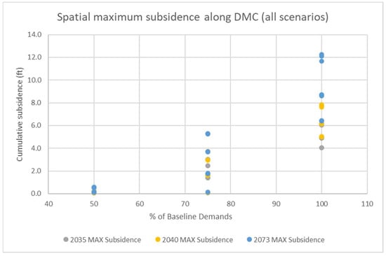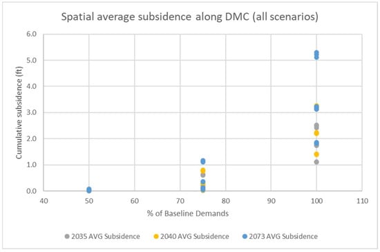 The analysis of Table 2 and Table 3 suggests that for the projected cumulative land subsidence to remain below 2 feet by the year 2073, irrigation demand reductions of between 50 and 75% of the HGSSJVM baseline irrigation demands [] would be necessary. The values presented in Table 2 and Table 3 are depicted graphically in Figure 3 and Figure 4, respectively.