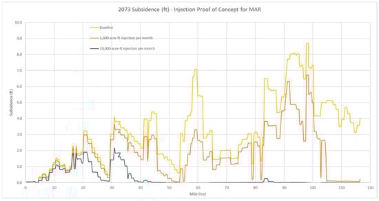 In [], the MAR scenarios simulated relied on the seepage of water diverted from existing conveyances and applied to the land surface. The representation of MAR simulated by the application of large volumes of surface water showed no appreciable impact on land subsidence. In our post-processing of the results, we found that a substantial fraction of the water applied for the purpose of MAR in these simulations became return flows to streams and drains and failed to relieve stresses in the deep groundwater aquifers and aquitards responsible for land subsidence along the DMC. To test the capability of MAR to reduce land subsidence along the DMC, we carried out two proof-of-concept simulations in which, rather than applying the MAR-augmented water supply to the surface, we injected water into the clay layers of selected cells in Zones 1 and 2 of the Delta–Mendota subbasin (see Figure 5 for a map of the zones). In the first scenario, we injected 1000 acre-ft per month into an appropriate model layer within each selected model cell. In the second scenario, we injected 10,000 acre-ft per month into the model layer and within the same model cells. The total predicted land subsidence by the end of the simulation period in 2073 was plotted for these scenarios and compared to the CVHM2 baseline (Figure 7). In this plot, the cumulative subsidence from 2020 to 2073 is plotted against mileposts that typically correspond to the location of control structures along the canal. These mileposts increase as one travels from north to south along the canal. In these proof-of-concept scenarios, the injected MAR water has a dramatic effect on the resulting subsidence. We did not change the demand from the Current Level of Demand for these scenarios, nor did we put any additional constraints on groundwater pumping. Hence, this proof-of-concept exercise helps to confirm the validity of the CVHM2 and shows that MAR can, in theory, if applied in a manner that circumvents hydraulic barriers to downward transmission in the groundwater system, contain land subsidence without any further reductions in groundwater pumping. Making this scenario effective would require deep well injection rather than surface water ponding, which is more typical of MAR applications, and it may not be economically feasible or technically achievable. For example, if aquifer properties are not favorable in the desired injection area or if clogging of the injection well occurs, it may not be possible to inject the desired volume of water. Nonetheless, the finding of our proof-of-concept MAR injection scenarios does suggest that a wider and more comprehensive examination of feasible MAR technologies and cost–benefit analyses would be desirable. While MAR alone, as currently conceived, cannot be expected to provide adequate constraints on future land subsidence along the DMC, it may have unrealized additional potential to mitigate future potential land subsidence.