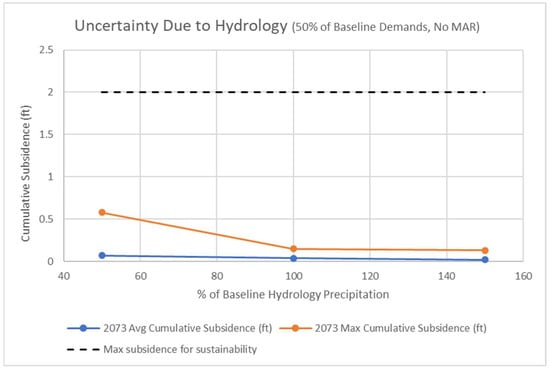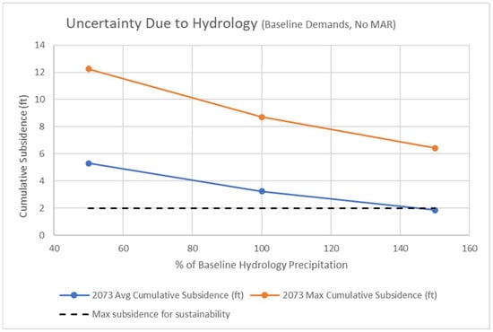 The analysis presented thus far has focused on the sensitivity of future subsidence to water demands and MAR. Examination of the results also suggests that hydrological uncertainty, such as that represented by future climate change, can have a significant effect on land subsidence. In this work, uncertainty is represented solely by unknown changes in precipitation; in other words, future climate regimes may be wetter or dryer. The perturbations performed demonstrated that this uncertainty has an impact on the resulting subsidence. For example, if we compare scenarios with undiminished Baseline Demands and No MAR in terms of the three different hydrology conditions, we find that by the year 2073 the cumulative land subsidence is an average of 5.30 ft in the dry hydrology scenario, 3.24 ft in the baseline hydrology scenario, and 1.85 ft in the wet hydrology scenario over the study area. The cumulative maximum land subsidence values are 12.26 ft, 8.71 ft, and 6.43 ft for the dry, baseline, and wet hydrology scenarios, respectively. This uncertainty due to hydrology in future subsidence projections is illustrated in Figure 8. It can be seen that the maximum 2073 cumulative subsidence values vary by a factor of two (~6 ft for wet hydrology vs. ~12 ft for dry hydrology). The assumed maximum 2073 cumulative subsidence limit of 2 ft is represented by the dashed line in Figure 8, illustrating that while hydrology has a significant effect, all scenarios simulated under the assumption of Baseline Demands violate this maximum limit.