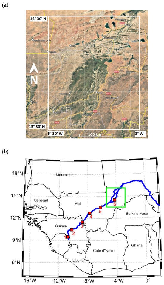 The Inner Niger Delta (IND), located in Mali, is a vast floodplain and wetland ecosystem that plays a crucial role in the hydrology, ecology, and livelihoods of the region. This unique inland delta is formed by the convergence of the Niger and Bani rivers, covering an area of about 30,000 to 40,000 km2, depending on seasonal variations in water flow [9]. The delta serves as a critical zone for water storage, groundwater recharge, and sediment trapping, with water levels fluctuating dramatically between the wet and dry seasons [19]. The geographical coordinates for the IND are 3° to 5°30′ longitude west and 13°30′ to 16°30′ latitude north, as illustrated in Figure 1a. Figure 1b shows the selected location (size of 0.5° × 0.5°) from the source of the Niger River in Guinea to the IND (see Section 3.2 for explanation).