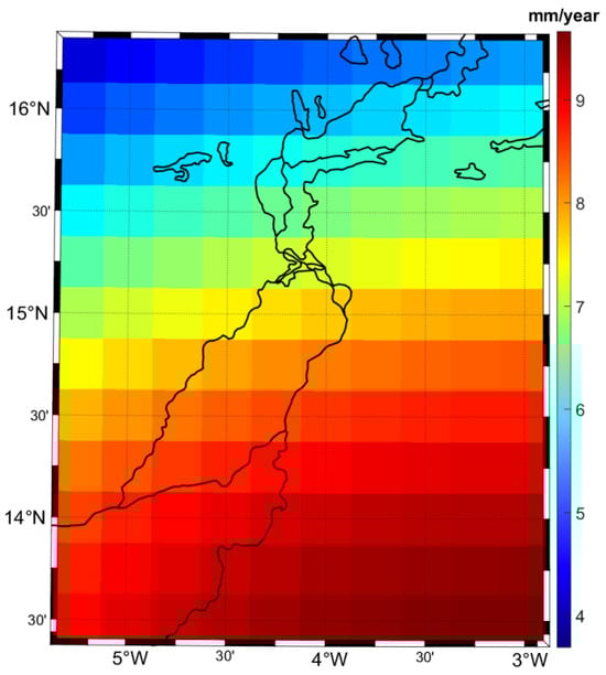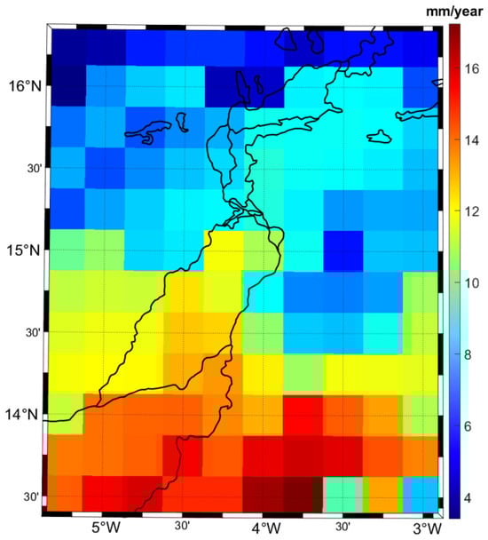 Figure 2 shows the long-term trends in TWS changes derived from GRACE/GRACE-FO data between April 2002 and September 2022. Figure 3 shows the same results for the GLDAS data. Generally, both datasets indicate a general increase in TWS across the entire region from 2002 to 2022, with no negative trends. Precisely, the GRACE-derived TWS trends exhibit positive values, ranging from a minimum of 4 mm/year to a maximum of 10 mm/year, indicating long-term increases in TWS. The southern part of the region (around 14° N latitude) demonstrates the most significant TWS increases, with values reaching approximately 9–10 mm/year (represented in red). In contrast, the northern areas (around 16° N latitude) experience more moderate increases, with trends of approximately 4–5 mm/year (represented in blue). The GLDAS map, however, shows more heterogeneity, with scattered patches of higher TWS increases. This could be due to surface processes such as soil moisture retention, changes in river discharge, or land surface hydrology. In fact, the GLDAS data cover a broader range (4 to 17 mm/year), showing more variations across the region. The scale again reflects positive trends, with red indicating higher values (around 16–17 mm/year) and blue representing lower values (around 4–5 mm/year). Similar to the GRACE map, the southern regions have smaller increases in TWS, while the northern parts exhibit larger increases (up to 16 mm/year in some areas). The spatial map of TWS trends is consistent with the findings of [10], in which mean TWS trends were found to range from 7 mm/year in the IND.
