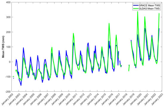 Figure 4 illustrates the mean TWS variations derived from the GRACE/GRACE-FO (in blue) and GLDAS (in green) over time, covering the period from April 2002 to September 2022 (missing months of GRACE-GRACE/FO data were omitted from the analysis). Both the GRACE and GLDAS show a distinct seasonal pattern in TWS variations. Peaks typically occur during the rainy season, and troughs during the dry season, with alternating increases and decreases indicating the natural hydrological cycle of water storage, driven primarily by precipitation, evaporation, and runoff. Overall, the seasonal trends in both datasets align well, with similar peaks and troughs across the entire period. This suggests that both datasets effectively capture the general seasonal variability in TWS in the region. There are some deviations between the datasets in terms of magnitude, with the GLDAS (green) sometimes showing higher peaks and deeper troughs than the GRACE (blue), especially noticeable between 2009 and 2015 [47]. This could reflect differences in how each dataset models or measures soil moisture and groundwater components. Notably, during the 2010–2015 period, the GLDAS shows higher TWS variations values compared to the GRACE. This divergence might be due to factors such as differences in model parameterization, with the GLDAS being a land surface model, whereas the GRACE measures mass variations, primarily in groundwater and large-scale hydrological processes [48]. The deviation is also seen during 2016–2018, where GRACE data exhibit lower values, possibly influenced by a lag in water storage recovery in deeper aquifers, which may not be captured as promptly by the surface water models used in the GLDAS. Around 2017–2018, there is a gap in GRACE data, corresponding to the end of the GRACE mission and the transition to GRACE-FO. After mid-2018, the trend continues with GRACE-FO, closely matching the seasonal trends observed with the GLDAS, indicating the reliability and continuity of GRACE-FO in capturing long-term water storage trends. From 2020 onward, both datasets suggest a steady increase in TWS variations, possibly indicating a recovery phase in the region’s water storage. In 2022, both datasets show a significant increase in TWS, suggesting a possible wet season or recharge event, which could be a notable finding for water resource management. Werth et al. [10] observed similar pattern in TWS variations in the region, particularly noting an increase in amplitude during the rainy seasons. Their study reported TWS variation values ranging from −170 mm in 2003 to 170 mm in 2016, capturing significant seasonal fluctuations over the period.