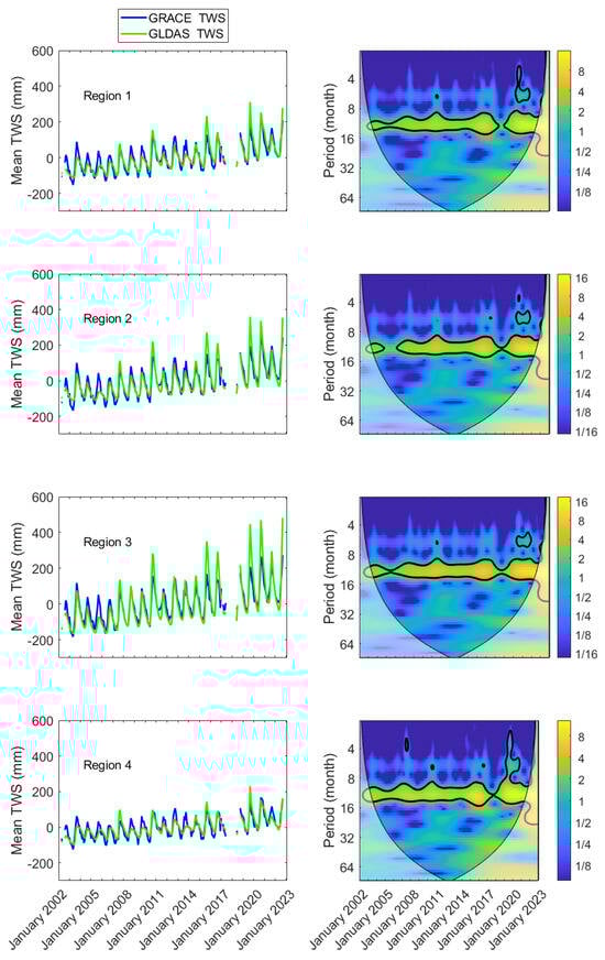 Mean seasonal TWS variations in each sub-region from GRACE/GRACE-FO (blue color) and GLDAS (green color) data, along with time–frequency spectra of cross-wavelet transform between GRACE/GRACE-FO and GLDAS data.
