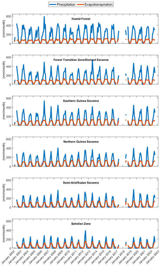 The third step in our methodology focused on analyzing TWS variations along the Niger River, with particular attention paid to the influence of precipitation and potential evapotranspiration. To achieve this, we selected six key locations along the river, each representing a different agroecological zone, as defined in [39]. The equivalent GIS layer can be found online (Africa Geoportal, 2017). The locations considered were strategically chosen to capture the diverse climatic and ecological conditions present along the Niger River’s path toward the IND. At each location, we analyzed the impact of precipitation and potential evapotranspiration on TWS variations, using data derived from the GRACE and GLDAS model. The latter provides high-resolution estimates of both precipitation and potential evapotranspiration, which are critical factors driving the water balance. We based our analysis on the assumption that TWS changes can be estimated by the difference between precipitation and potential evapotranspiration. This approach follows the method proposed by [4,41,42,43], which relates changes in TWS over time () to the balance between incoming and outgoing water in the system. The relationship is expressed as follows: