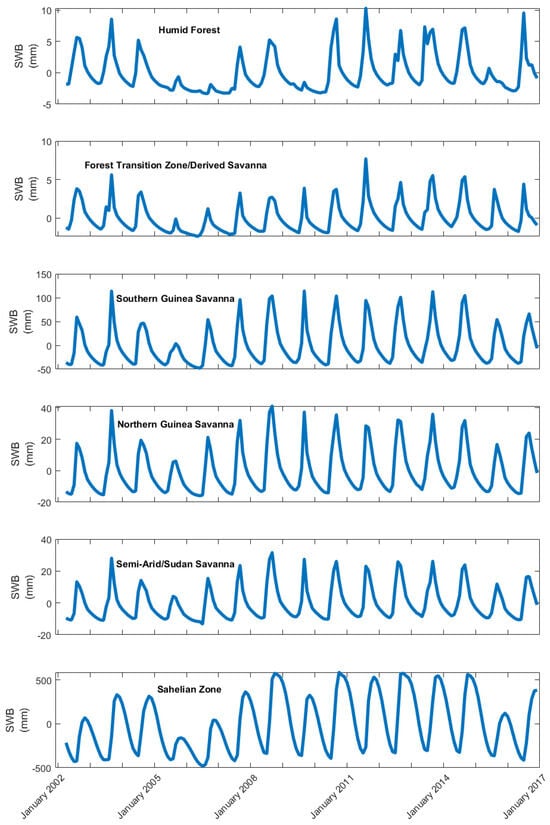Figure 8 illustrates surface water body variations derived from the WGHM for April 2002 to the end of 2016 across six distinct locations. The magnitude of variation differs significantly among regions. In the humid forest and Forest Transition Zone, fluctuations range within ±10 mm, indicating relatively stable water levels. The Southern Guinea Savanna shows more pronounced variations, ranging from approximately −50 mm to +150 mm, reflecting moderate seasonality. The Northern Guinea Savanna and Semi-Arid Sudan Savanna display variations between −20 mm and +40 mm, highlighting a transition toward more pronounced seasonal fluctuations. The Sahelian zone exhibits the most extreme fluctuations, with values spanning from −500 mm to +500 mm, demonstrating high sensitivity to seasonal changes. Across all locations, the data reveal an annual periodicity, with peak water levels occurring consistently during the rainy season.
