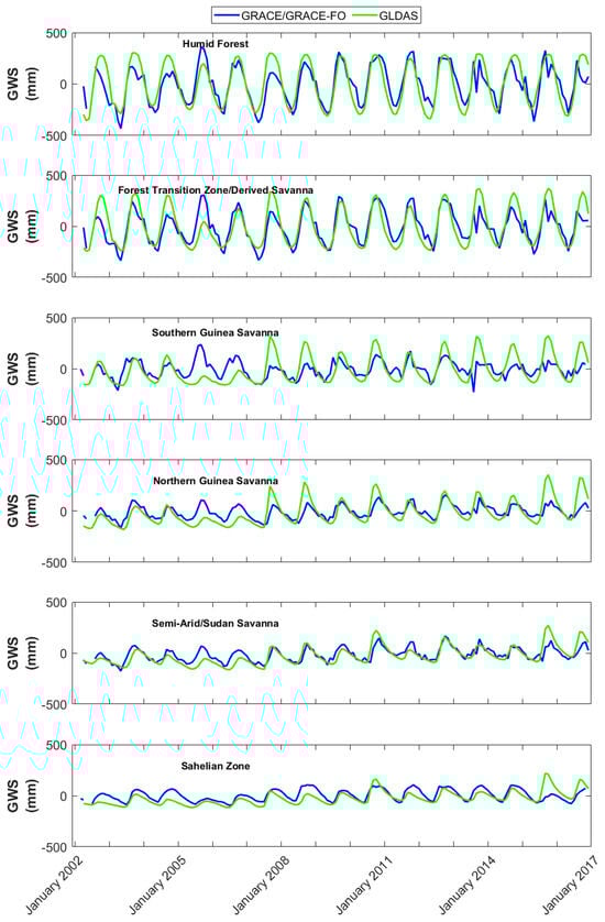 In the humid forest region, the time series show consistent seasonal fluctuations in GWS with amplitudes of around ±500 mm. The GRACE/GRACE-FO generally follows the GLDAS but with a slight phase lag, indicating a delay in capturing peak seasonal changes [57]. The Forest Transition Zone/Derived Savanna show almost similar patterns, but with slightly reduced amplitudes. In the Southern Guinea Savanna zone, seasonal variations range between ±200 and ±300 mm, significantly lower than in more humid areas. The GRACE/GRACE-FO appears to underestimate the maximum storage compared to the GLDAS, particularly during high-water periods.