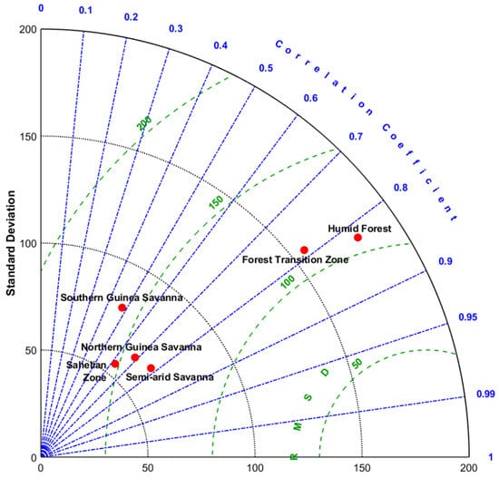 Table 5 summarizes statistical metrics comparing GWS estimates from the GRACE/GRACE-FO and GLDAS. The Pearson correlation varies from 0.63 to 0.83 (except for the Southern Guinea Savanna zone), with highly significant p-values at the 95% confidence level. Large water dynamics in humid areas may explain the higher RMSE observed in these regions. These findings align with other regional studies, showing that the GRACE captures broader mass variations, while the GLDAS integrates surface-level changes, leading to discrepancies during periods of rapid surface water changes [55].